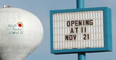 Fact is, we have some truly inspired marquee writers on this island. If I see a sign I really like, I will frequently pull over, dig out the digital camera I usually keep stashed in the car and snap a quick shot. So now I have a growing collection of "great marquees I have seen" photographs. While I am not a big fan of the Biblical quotation marquees, I have discovered that such signs can lead to some interesting juxtapositions. For example, I got a pretty good shot of a guy doing repair work up high on top of a sign that says "He is Risen" -- right after that big Easter storm we had in '00. Another recent favorite was the one posted on Whataburger's marquee just before Thanksgiving - "Opening at 11, Nov. 21." From the right angle, you could get the water tower with the city's logo positioned right next to it. With a little creative cropping, I got a shot that looks like SPI planned to open exactly half an hour after the bridge did.