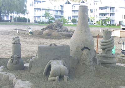 PARTYCARVEPARTYLocation: Harrison Hot Springs, British Columbia Event: World Championship Dates: Sept. 8-10, 2000 Particulars: This is the fifth in a (planned series) of art gallery pieces. I probably spent too much time writing the haiku for the poster as I don't think many people bothered to read them but I like the idea of incorporating writing into the finished piece and may try it again someday. The main idea I was playing with here was that of peeking behind the "canvas" of a very typical still life. Though the piece did not place in the money, I feel I was successful nonetheless. Other sculptures in the series: Quebec, Myrtle Beach, Las Vegas, Port Aransas Other entries in this competition: click here |