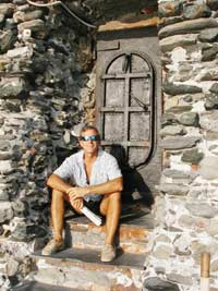 We have finally settled in here in Vernazza though it did take nearly 18 hours to do so. But it was definitely worth the wait and the hassle. This is one of the most lovely places I have ever been and Rick Steves really does know of what he speaks. (RS himself is reportedly here in town as I write this and no doubt finds it gratifying to see all of us wandering around clutching his books to our American bosoms.) When I last wrote we were enjoying Signora Ugolini's fritatta in Riccione and planning our escape to Cinque Terre. Originally we had thought to leave very early Tues. morning on a trainride that would have included a lunch stop in Pisa, but that plan changed sometime Monday evening. After the stop at Internet point, we pedalled to a beachfront restaurant for some cool refreshment and a good view of a fireworks display. There we were greeted by a charming girl from the Czech Republic who spoke flawless English - our waitperson - and the not-so-charming local practice of tacking on a $5 service charge to already outrageous tab. You definitely pay for that little piece of beachfront property... At any rate we were up pretty late that night and so we decided to give both ourselves and Leo (who graciously offered to drive us to the train station in Rimini) a break and take a later train with a connection in Parma. On the way we re-read the Cinque Terre section on RS' Italy book and that is when we decided to look for a camera (room) in Vernazza. While even RS admits that he has somewhat ruined the place by declaring it his favorite of the 5 towns we decided how bad can it be to share the place with a bunch of like-minded folks? We arrived in town about 5 pm yesterday without reservations. We had called a few places from the La Spezia station without luck - of our top 3 choices, Giuliano did not answer his phone and the other two were already booked - so were primed to grab the first opening that presented itself - Pensione Sorriso. The room was very small but clean and cheerful and Ricardo at reception was welcoming and ready to draw us a cold beer (available only for guests, and we were pretty thirsty at that point.) The room was located up many flights of stairs but still offered a view that consisted mainly of the building on the other side of the road. Even so, we had a door and a handkerchief-sized balcony and were spending less than 100 euro for the night so we went with it. Took our initial stroll down Via Roma and got the full impact of its Disneyland picture postcard appeal. Found an English language newspaper! The harbor was bustling and lots of kids on the beach. Enjoyed adult beverages at the bar on the end of the jetty - Fred strolled with the camera while I inhaled the news and enjoyed the local white wine... molto buono. |