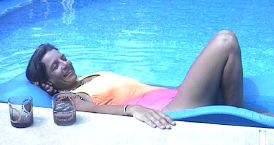 I spent two and a half weeks in San Diego working on the world's tallest and largest sand sculpture with about 100 sculptors from all over the world in Aug. & Sept. of 1997. It was a lot like being at summer camp.... Right: Fashionable sandsculptor headgear, thanks to Amazin' Below: If I were going to tattoo myself, it might look very much like this. Here I am posing with the artist, Rusty Croft, sporting a tattoo I drew on him. |